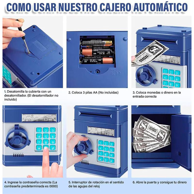 Este modelo cuenta con apertura electrónica mediante código, lo que brinda una sensación de protección adicional para el dinero almacenado. Su estructura compacta facilita su colocación en escritorios, habitaciones o espacios personales sin ocupar demasiado espacio. Además, su funcionamiento electrónico aporta una experiencia interactiva que motiva el hábito del ahorro constante.