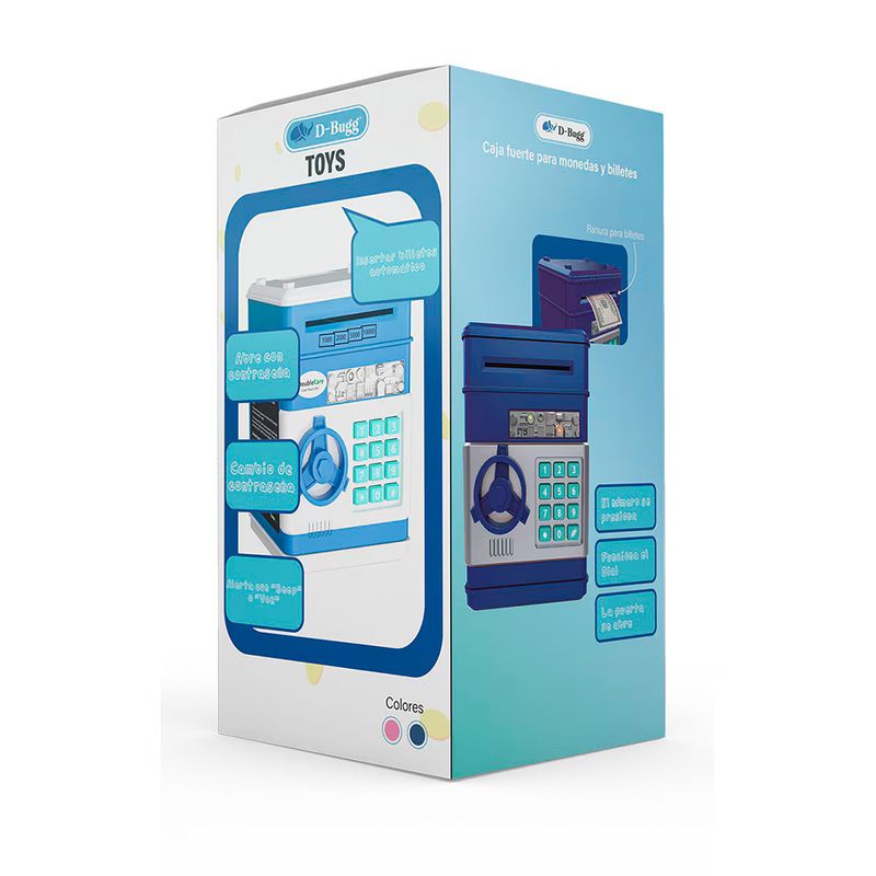 La alcancía electrónica D-Bugg diseño caja fuerte azul es una opción moderna y segura para guardar monedas y billetes de manera práctica. Su diseño tipo caja fuerte con teclado digital permite simular la experiencia de un sistema de seguridad real, haciendo del ahorro una actividad más atractiva y organizada. Es ideal para niños, jóvenes o cualquier persona que busque una alcancía funcional con un toque tecnológico.