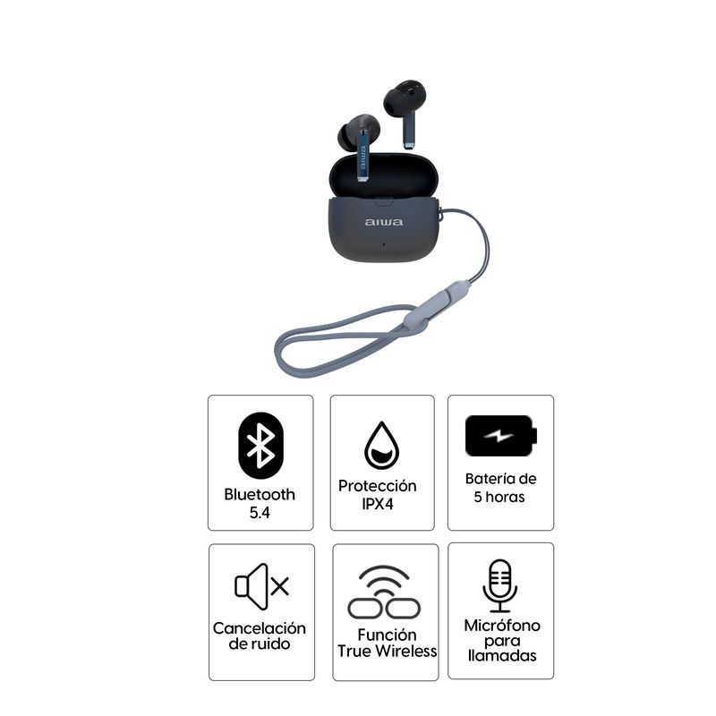 Los audífonos Bluetooth True Wireless Aiwa en color negro combinan estilo y tecnología para ofrecerte una experiencia auditiva superior. Con diseño moderno y ligero, son perfectos para llevar a cualquier lugar.