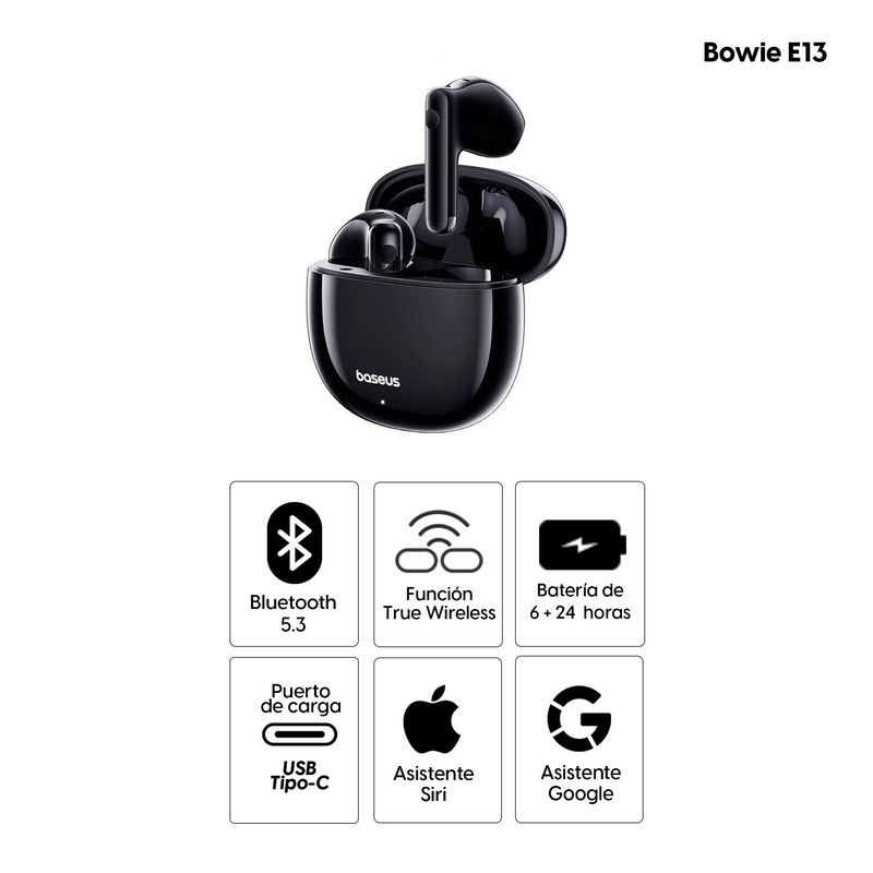 Diseño ergonómico y sonido envolvente para tu día a día: Los audífonos Baseus Bowie E13 combinan un diseño compacto y cómodo con drivers dinámicos de 12 mm, ofreciendo una experiencia auditiva inmersiva. Su acabado en color negro y estuche de carga liviano garantizan una experiencia portátil y confiable.