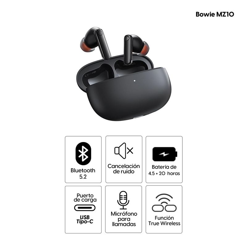 Con hasta 24.5 horas de autonomía total gracias a su estuche de carga, los Bowie MZ10 combinan eficiencia y rendimiento. Incorporan control táctil inteligente, conexión Bluetooth 5.3 y modo transparencia para mantenerte consciente del entorno cuando lo necesites.