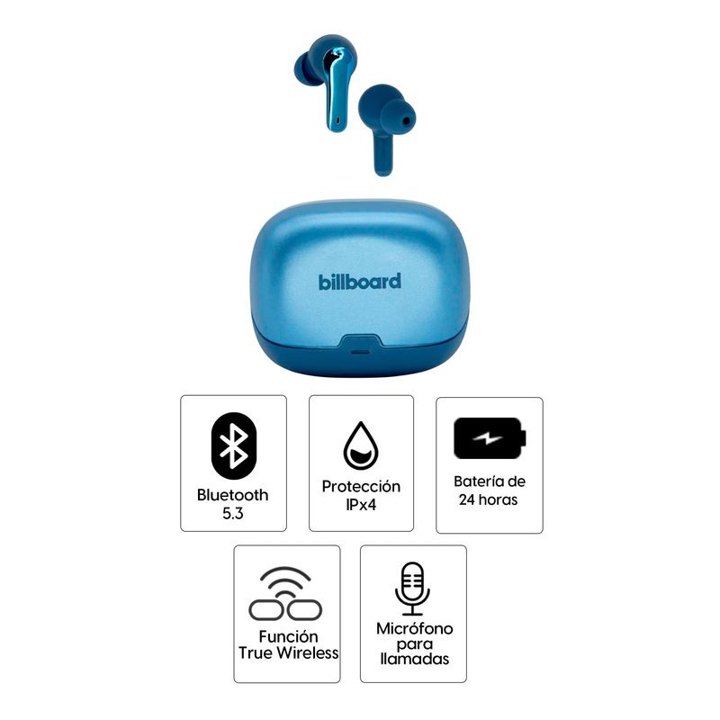 La batería de los Billboard Unite ofrece una duración total de hasta 24 horas con el estuche de carga, permitiendo escuchar música durante todo el día. Su micrófono integrado asegura llamadas claras, mientras que su formato inalámbrico elimina los cables para una experiencia más cómoda. Estos audífonos True Wireless son una excelente opción para quienes buscan practicidad, resistencia y buen desempeño en un solo dispositivo, convirtiéndose en el complemento ideal para el día a día en cualquier entorno.