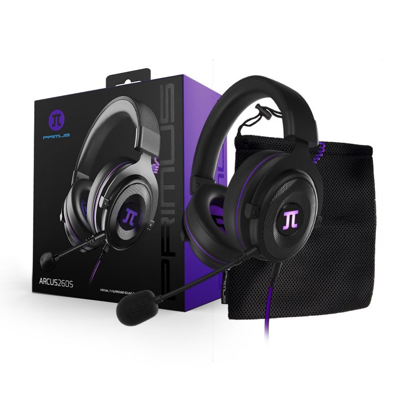 Los audífonos gamer Primus ARCUS260S en negro con detalles morados ofrecen una experiencia de audio inmersiva con diseño cómodo y moderno para largas sesiones de juego.