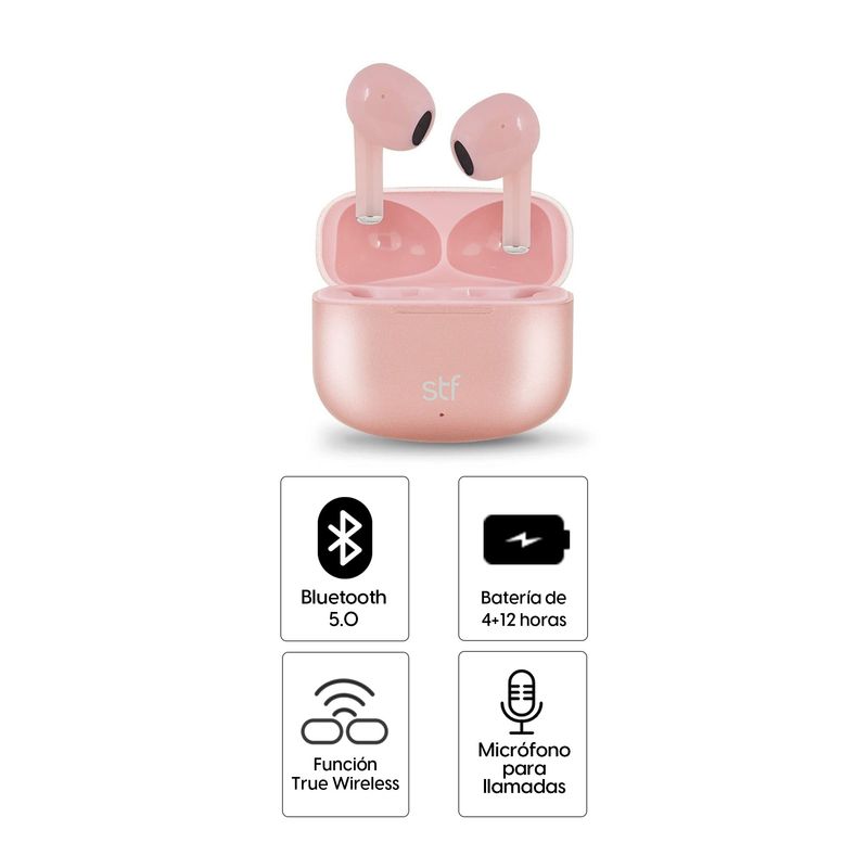 Con acabado en color rosado y estilo moderno, los STF Aurum ST-E01386 combinan elegancia y rendimiento. Son ligeros, compactos y perfectos para quienes buscan audífonos prácticos, con buena autonomía y un toque de color.