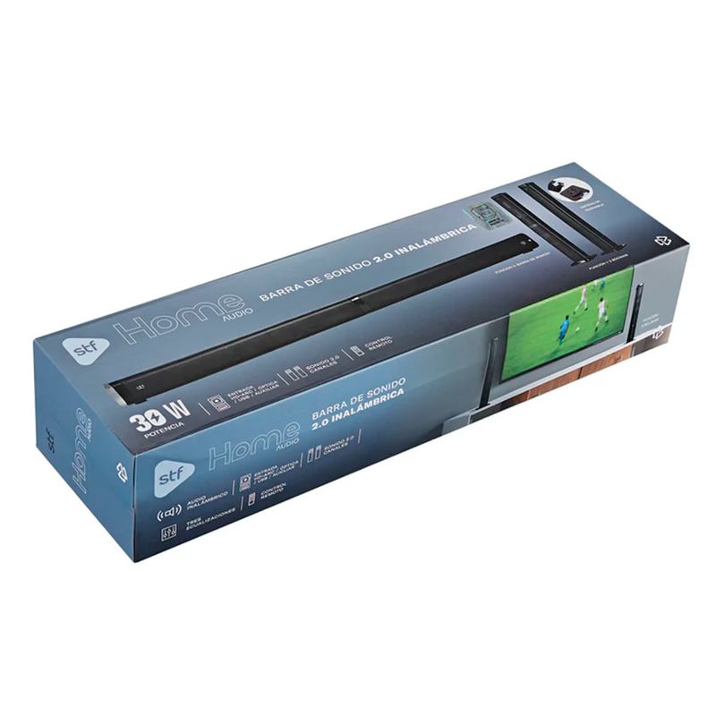 La barra de sonido inalámbrica STF 2.0 con subwoofer de 30 W está diseñada para mejorar la experiencia de audio en televisores, computadoras y dispositivos multimedia. Su sistema de sonido ofrece mayor potencia y claridad en comparación con las bocinas integradas de los televisores, permitiendo disfrutar diálogos más nítidos y efectos de sonido mejor definidos. Gracias a su diseño compacto, se adapta fácilmente a diferentes espacios del hogar sin ocupar demasiado lugar, aportando un estilo moderno y discreto.