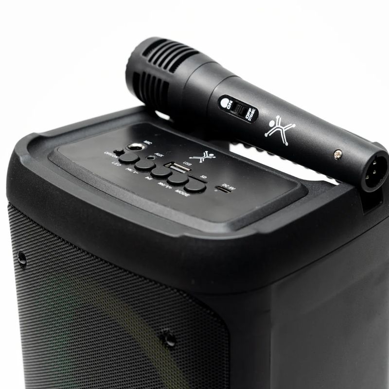 Incluye micrófono para disfrutar sesiones de karaoke y animar tus eventos. Su conectividad te permite reproducir música fácilmente desde diferentes dispositivos, brindando versatilidad y comodidad.
