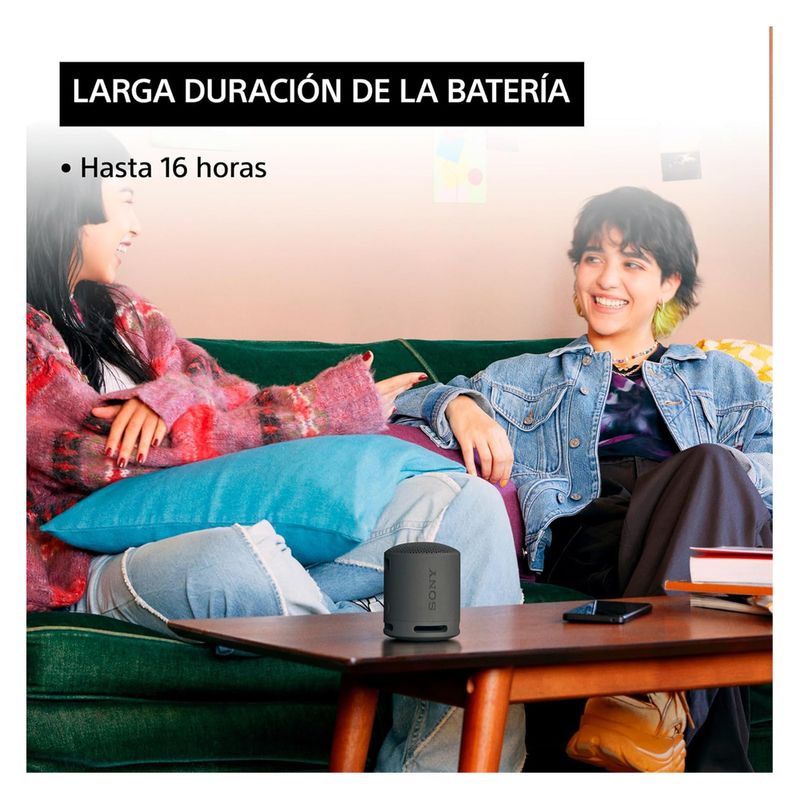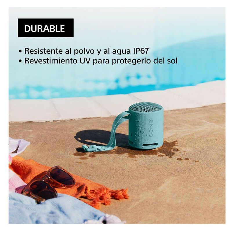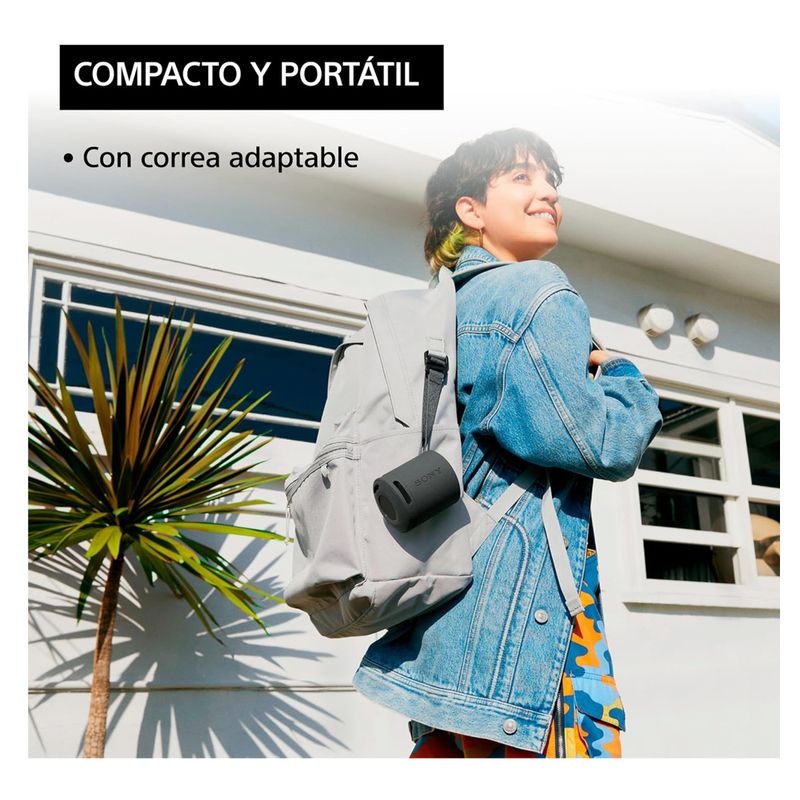 Cuenta con batería de hasta 16 horas de reproducción continua y resistencia al agua y polvo con certificación IP67, ideal para usar en exteriores, viajes o fiestas. Incluye correa adaptable para llevarla fácilmente donde vayas.