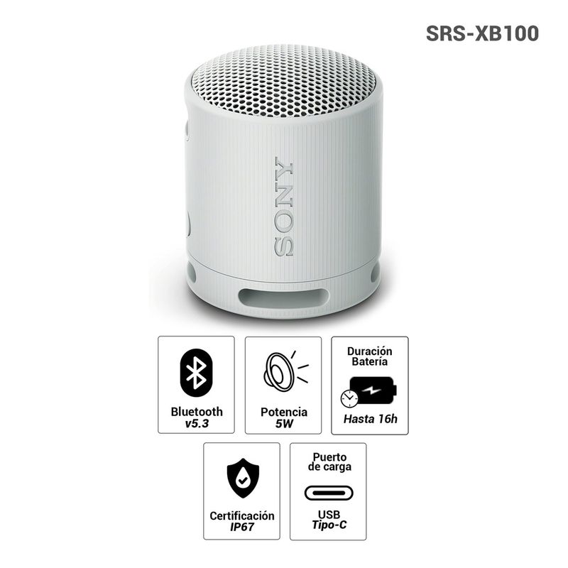 Gracias a su clasificación IP67, la SRS-XB100 es resistente al agua y al polvo, lo que la hace ideal para llevarla a la piscina, a la playa o a cualquier aventura al aire libre sin preocuparte por las condiciones. Su diseño compacto y liviano permite transportarla fácilmente, llevándola a cualquier lugar donde quieras escuchar música sin restricciones.