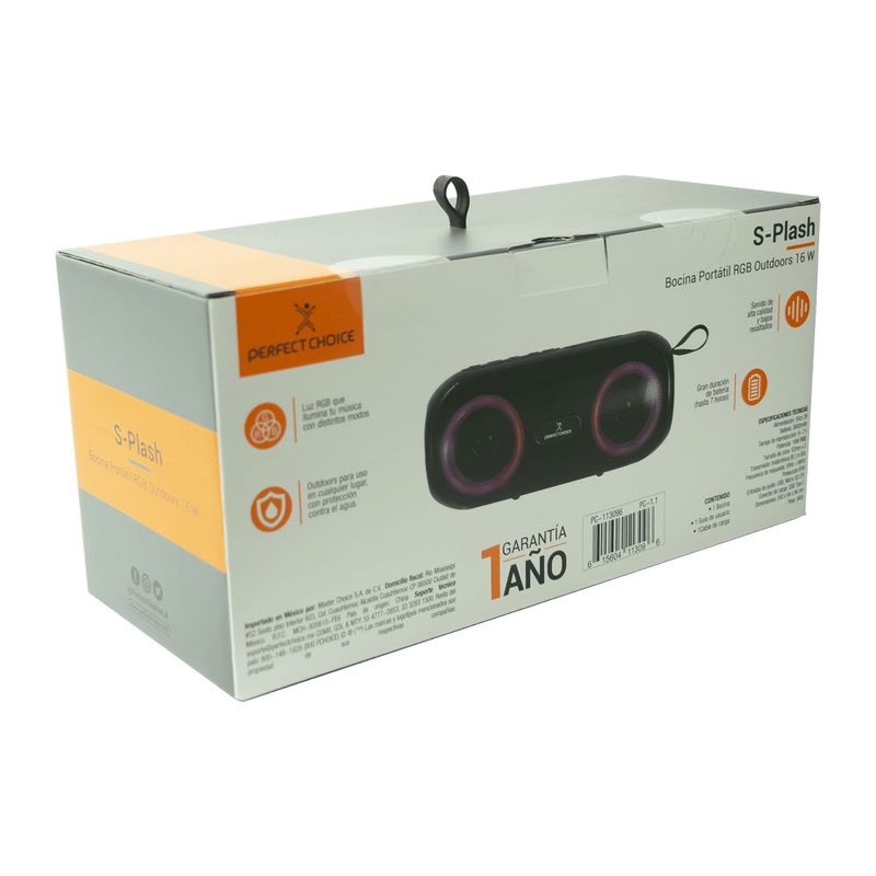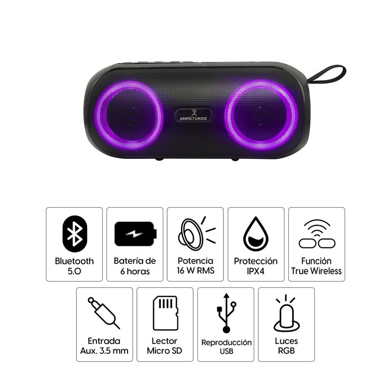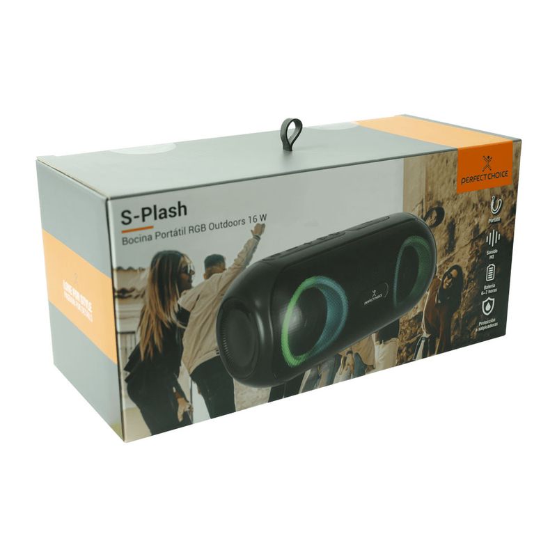 La bocina portátil Bluetooth Perfect Choice S-Plash ofrece sonido potente y claridad excepcional con sus 16W RMS, ideal para interiores o reuniones al aire libre. Su diseño moderno con luces RGB crea un ambiente vibrante y dinámico al ritmo de la música.