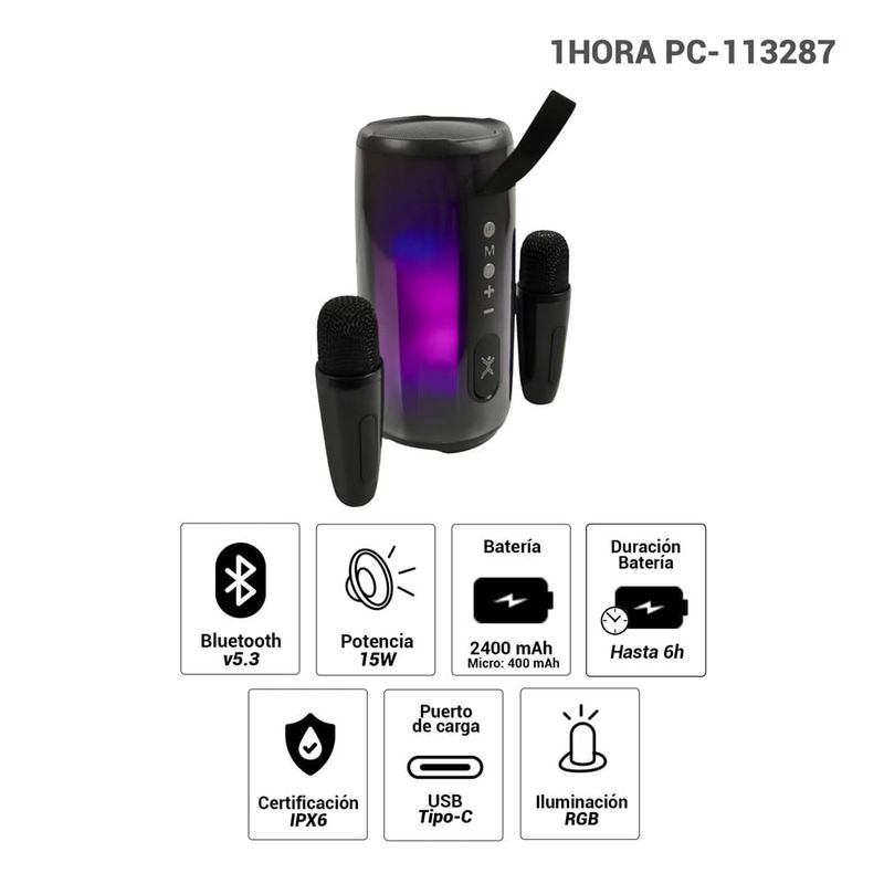 La bocina portátil Perfect Choice Cosmo PC-113287 ofrece un sonido potente y claro con sus 15W de salida RMS, ideal para fiestas, reuniones o karaoke. Incluye dos micrófonos inalámbricos para disfrutar de una experiencia divertida y completa en cualquier ocasión.