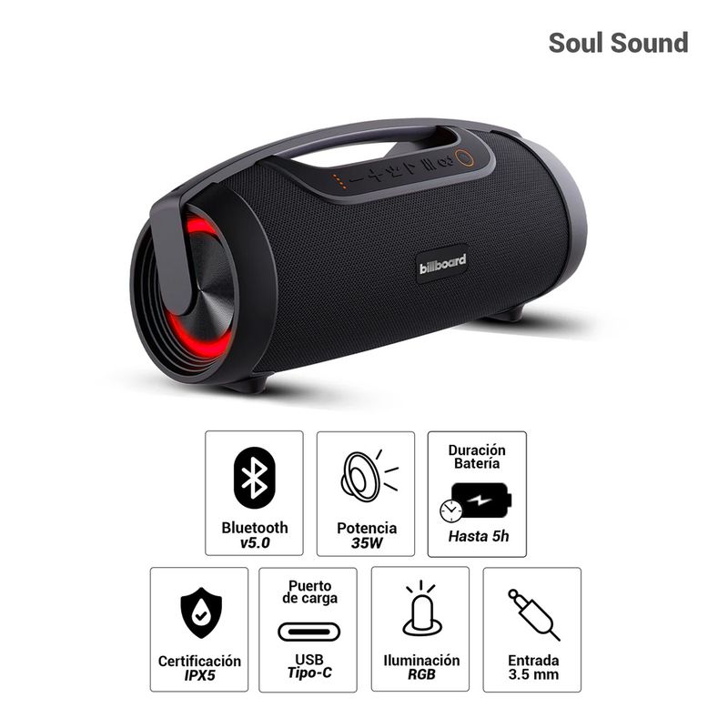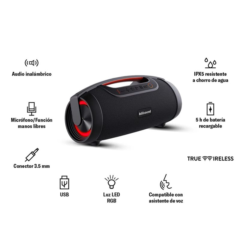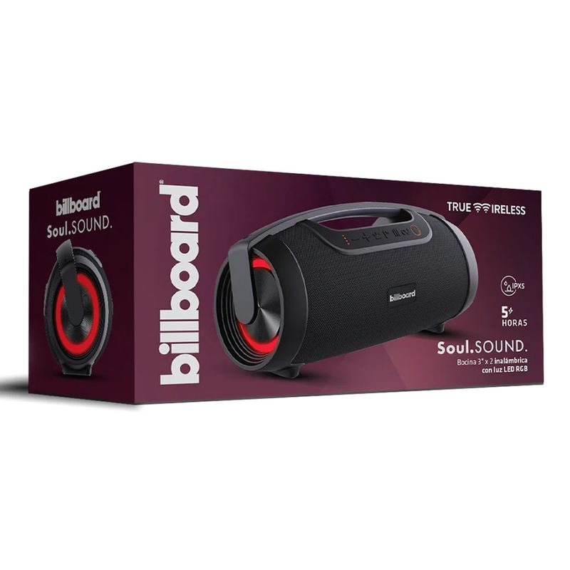 La bocina inalámbrica Billboard Soul Sound 35W ofrece un sonido estéreo potente y claro, ideal para disfrutar de música de calidad en cualquier lugar.