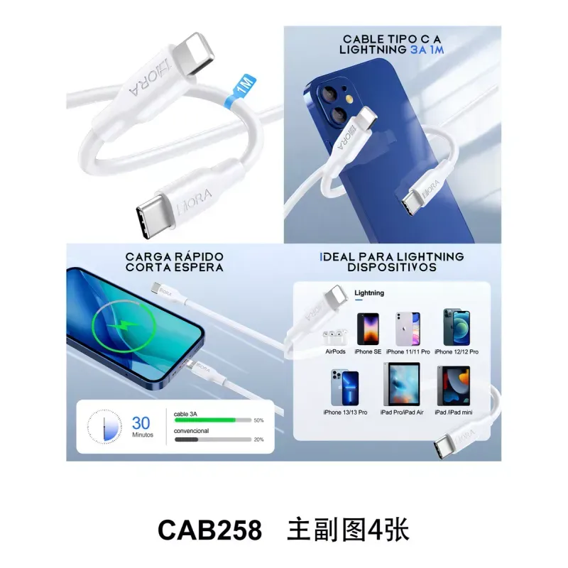 El cable 1Hora USB Tipo-C a Lightning de 3A ofrece carga rápida y transferencia de datos estable para tus dispositivos Apple. Su diseño de 2 metros brinda mayor libertad de movimiento y comodidad en cualquier entorno.