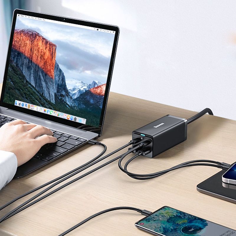 El cargador de pared Baseus GaN3 Pro Desktop de 100W ofrece potencia y versatilidad para cargar múltiples dispositivos al mismo tiempo. Su tecnología GaN3 optimiza la eficiencia energética y reduce el calentamiento, garantizando una carga más segura.