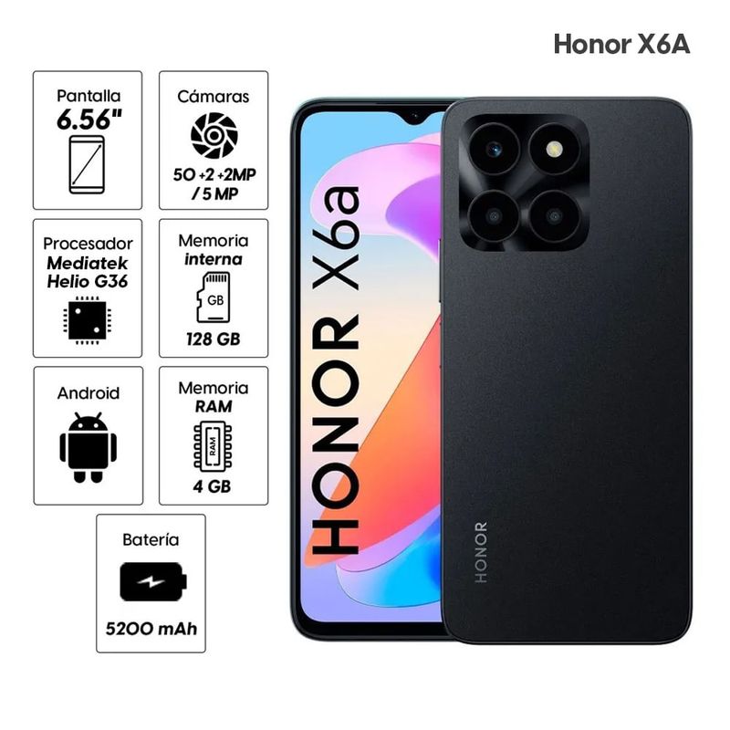 Diseñado en color negro y con batería de larga duración, el Honor X6a combina potencia, estilo y funcionalidad. Es el smartphone ideal para quienes buscan un dispositivo moderno, eficiente y con gran capacidad de almacenamiento.