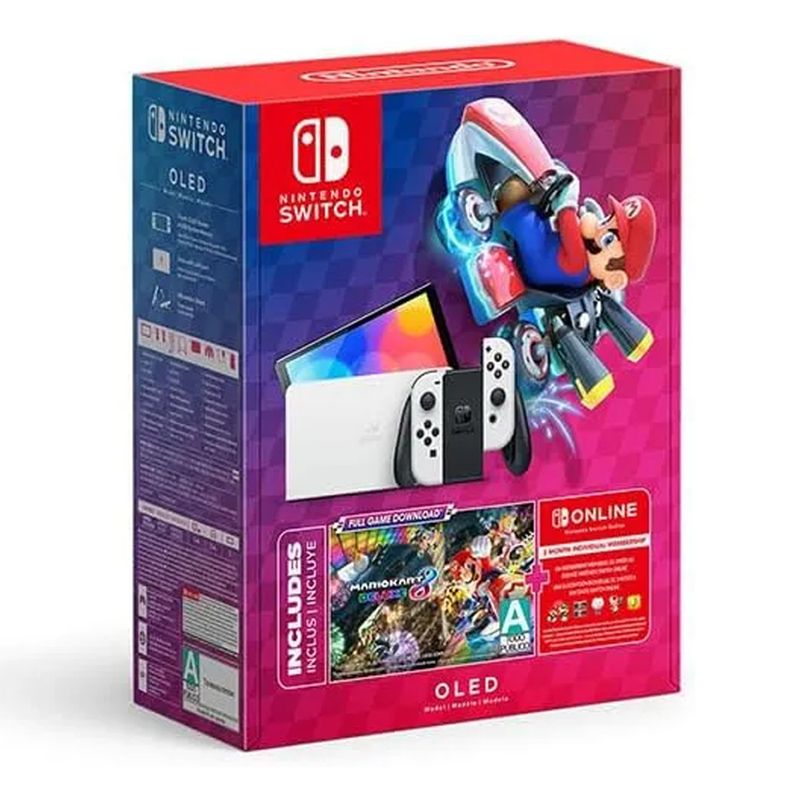 La consola Nintendo Switch OLED en color blanco llega en su versión bundle con el juego Mario Kart 8 Deluxe y 3 meses de suscripción a Nintendo Switch Online, ofreciendo entretenimiento inmediato para toda la familia.