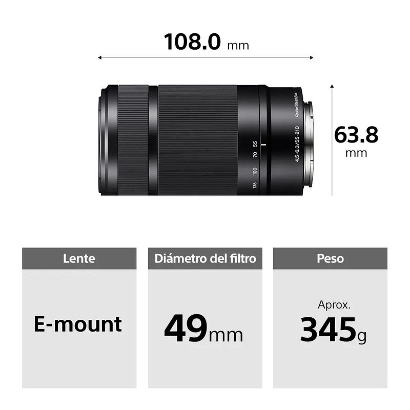 El lente Sony 55-210mm f/4.5-6.3 OSS es un teleobjetivo versátil diseñado para cámaras con montura E y sensor APS-C. Su rango de zoom ofrece gran flexibilidad para capturar retratos, paisajes y sujetos a larga distancia con excelente claridad.