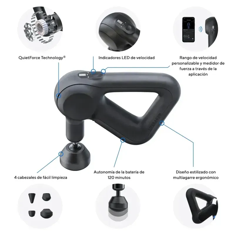 Equipa un potente motor con tecnología QuietForce que reduce el ruido sin sacrificar potencia. Ofrece cinco velocidades ajustables y conectividad Bluetooth para personalizar rutinas y controlar la intensidad desde la app Therabody.