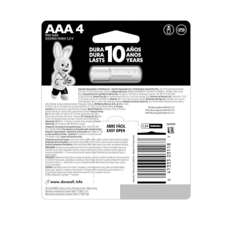 Las pilas recargables Duracell AAA de 900mAh ofrecen energía confiable y de alta capacidad, ideales para dispositivos de uso frecuente como controles, cámaras, juguetes y más.
