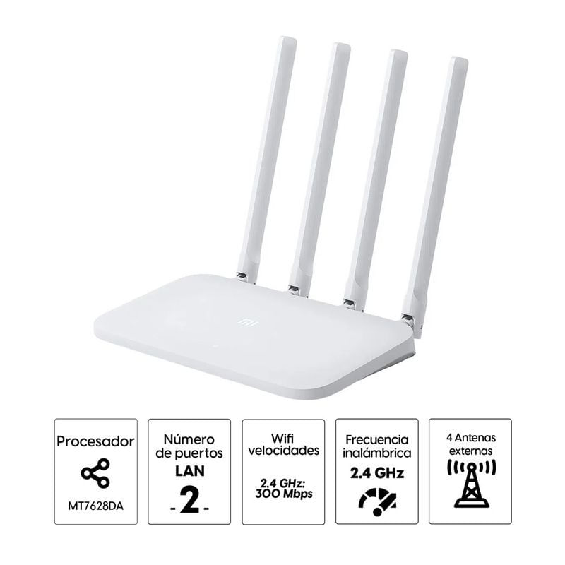 En color blanco, el Mi Router 4C combina tecnología, potencia y facilidad de uso. Es la opción perfecta para quienes buscan un router confiable, rápido y con administración inteligente desde el smartphone.