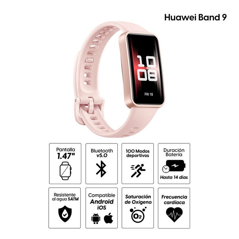 La Huawei Band 9 en color rosado ofrece un diseño moderno y elegante con pantalla AMOLED de 1.47", ideal para visualizar tus notificaciones y datos de salud con claridad.