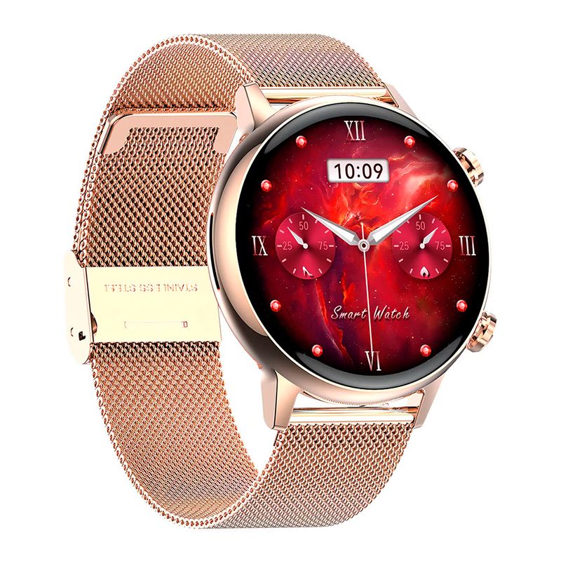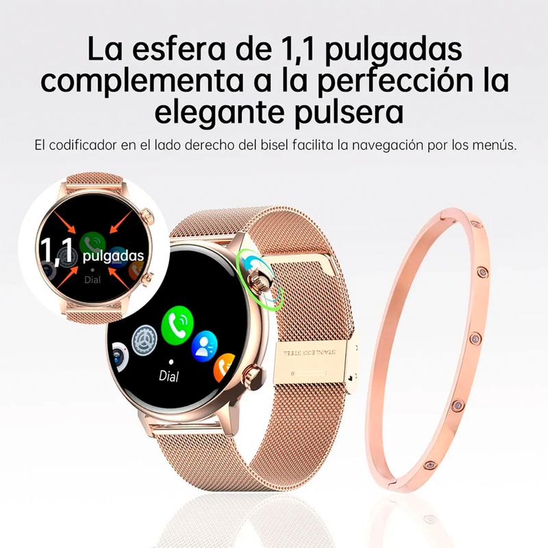 El smartwatch G-Tide Romance en color dorado es la combinación perfecta entre estilo sofisticado y tecnología funcional. Su pantalla AMOLED de 1.1 pulgadas ofrece una excelente calidad visual, con colores vibrantes y gran nitidez, permitiéndote visualizar notificaciones, actividad diaria y la hora con total claridad. Su acabado elegante lo convierte en un accesorio ideal tanto para ocasiones formales como para el uso cotidiano.