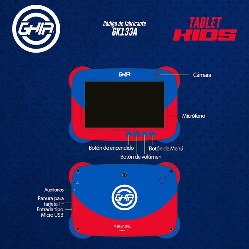 La tablet Ghia GK133A de 7" está diseñada para niños, combinando diversión y aprendizaje en un dispositivo compacto y ligero. Su pantalla de 7 pulgadas brinda una visualización cómoda y colores vibrantes.