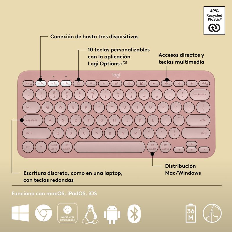 En color rosado, el Logitech Pebble 2 K380S destaca por su estilo minimalista, tamaño compacto y gran compatibilidad. Es la opción perfecta para quienes buscan un teclado inalámbrico funcional, estético y práctico para trabajar o estudiar desde cualquier lugar.